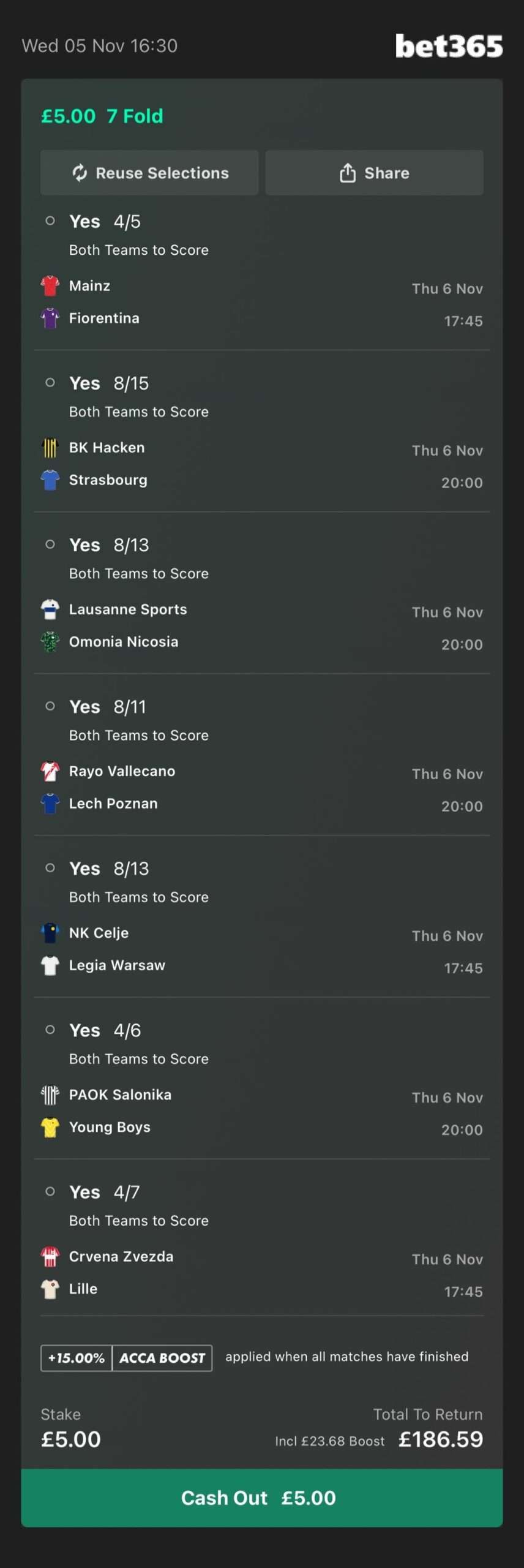 This accumulator is with Bet365. There is a link below which will add each selection directly to your bet slip in just 1 click!