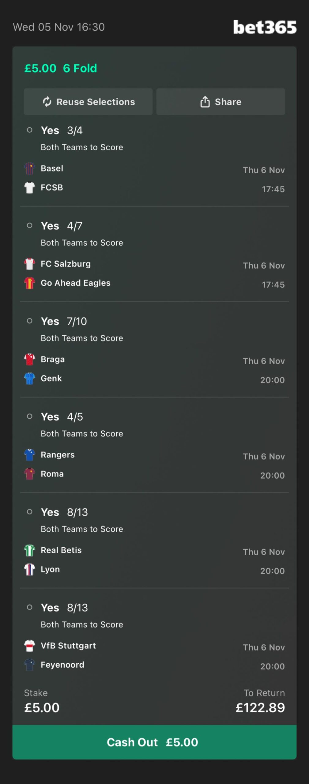 This accumulator is with Bet365. There is a link below which will add each selection directly to your bet slip in just 1 click!