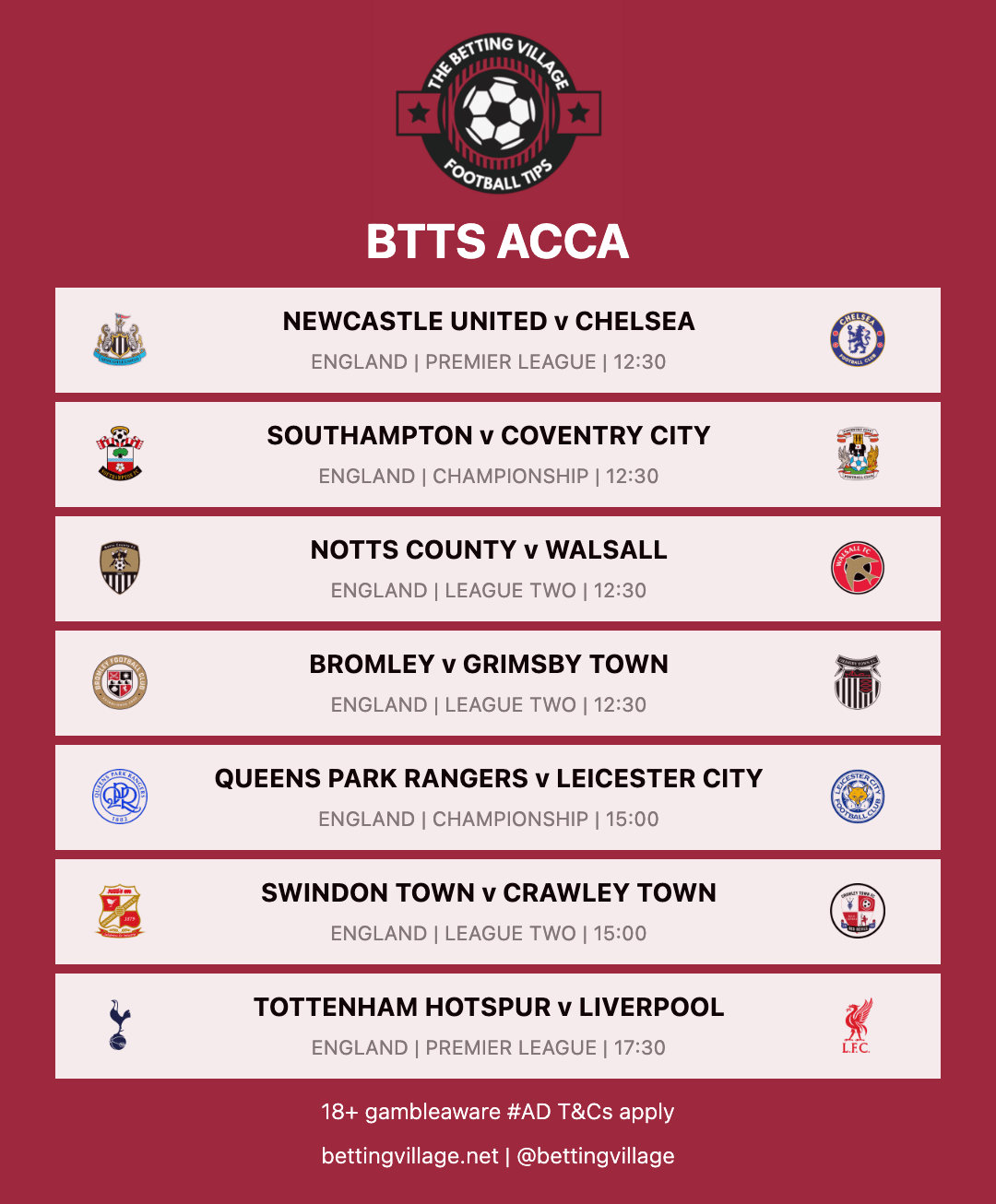 This accumulator is with Bet365. There is a link below which will add each selection directly to your bet slip in just 1 click!