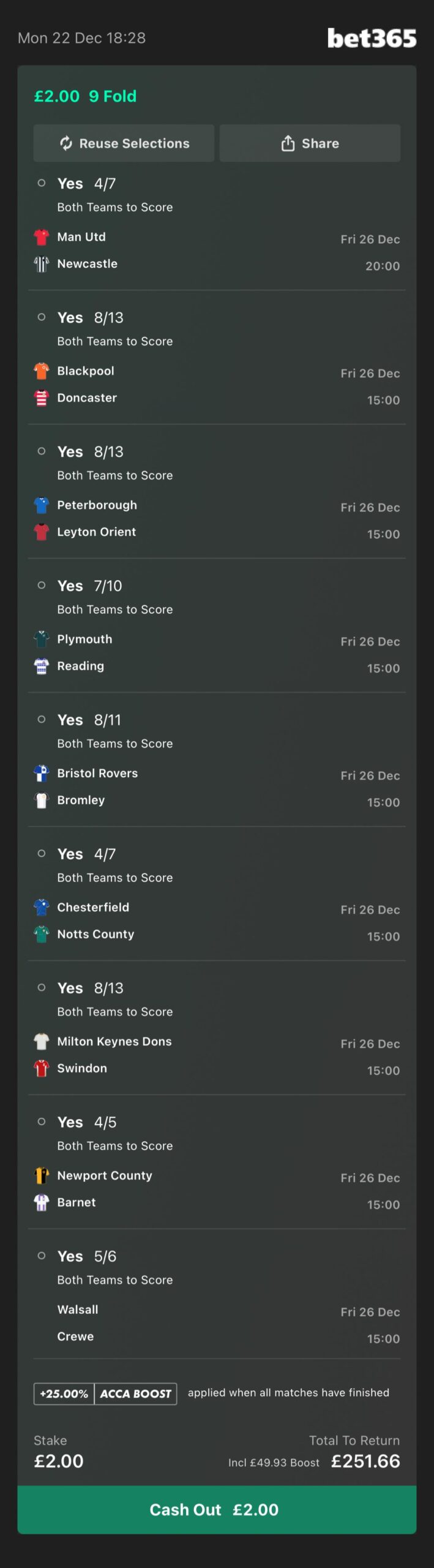 99/1 + 25% Acca Boost at the time of posting. Prices subject to change. Always check each selection matches up to the image above.