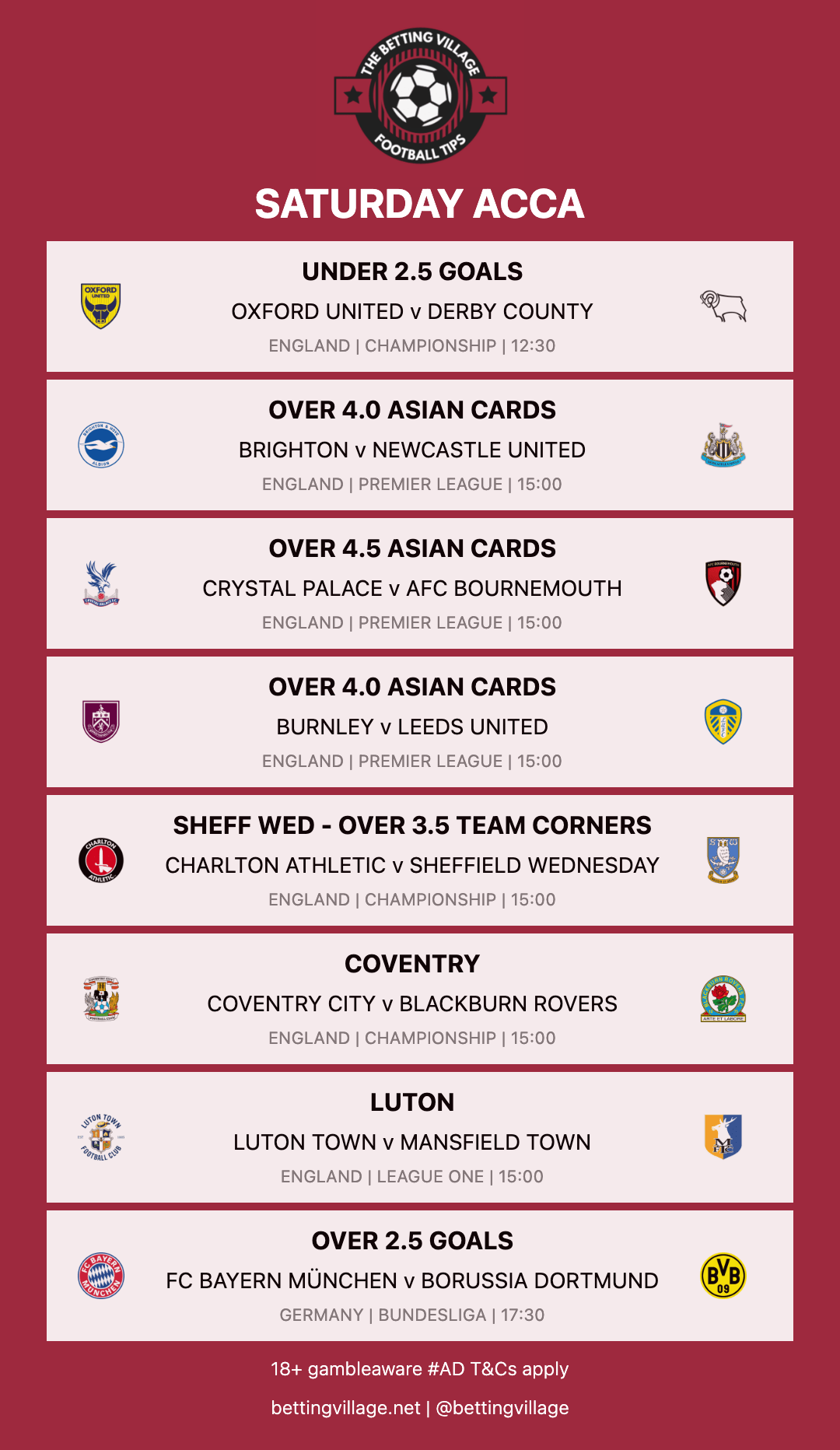 This accumulator is with Bet365. There is a link below which will add each selection directly to your bet slip in just 1 click!