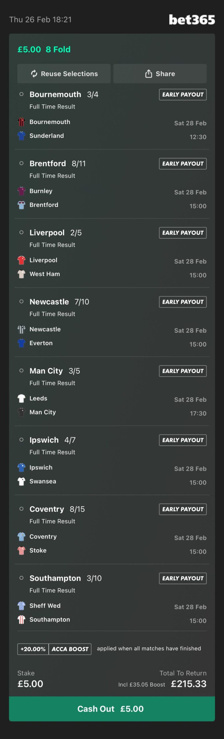 This accumulator is with Bet365. There is a link below which will add each selection directly to your bet slip in just 1 click!