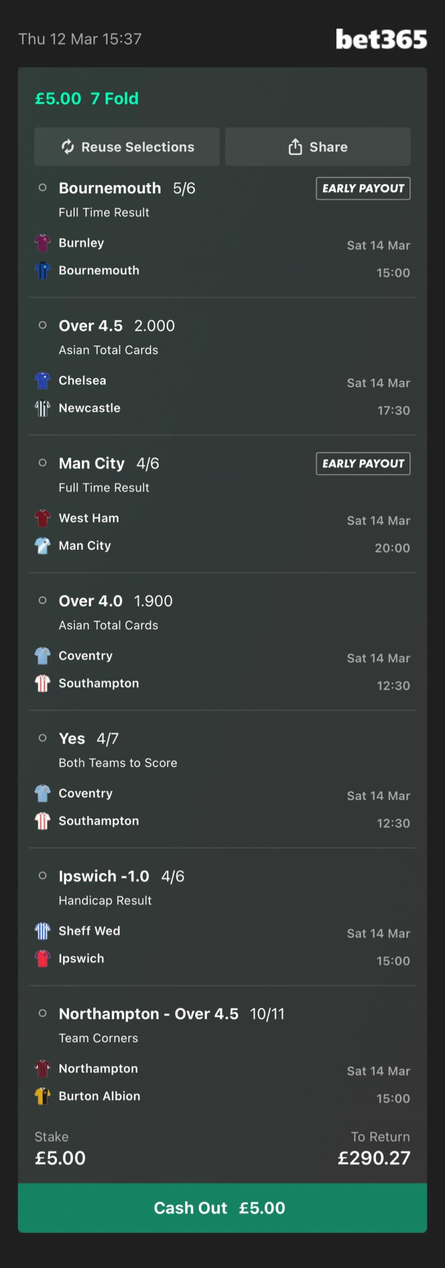 This accumulator is with Bet365. There is a link below which will add each selection directly to your bet slip in just 1 click!