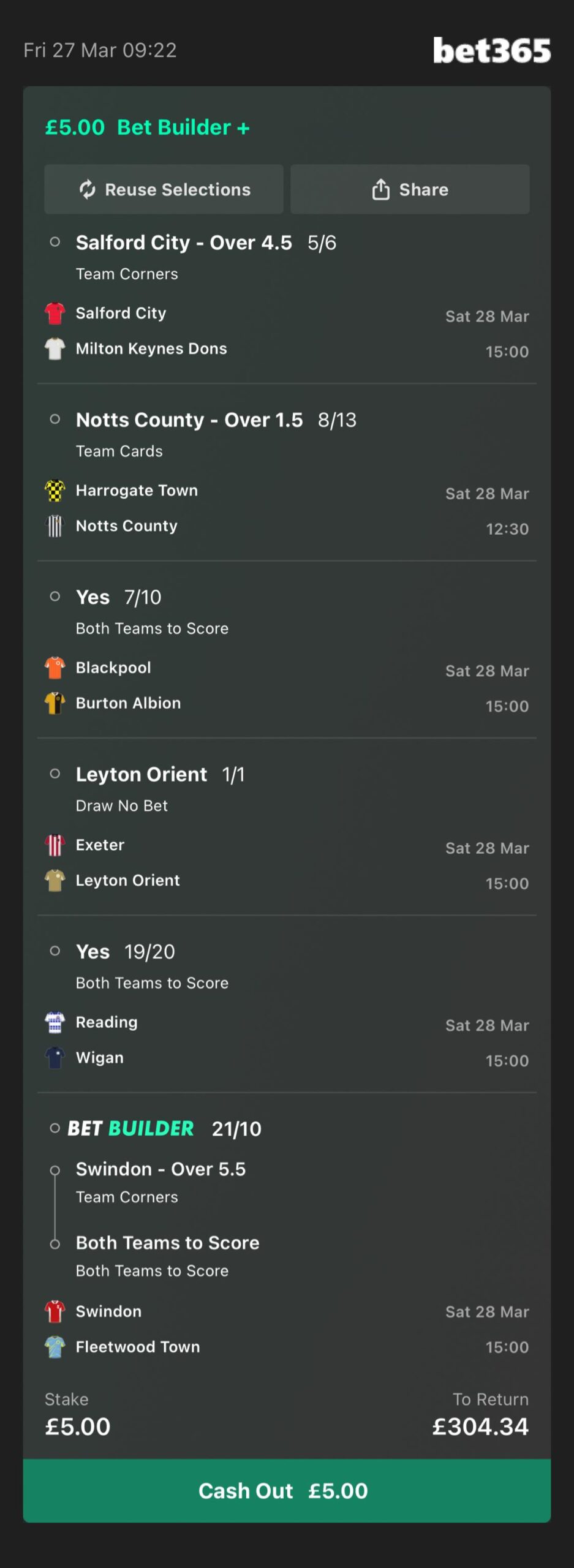 This accumulator is with Bet365. There is a link below which will add each selection directly to your bet slip in just 1 click!