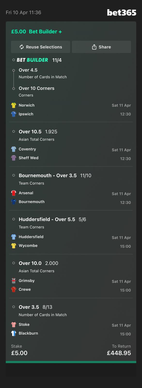 This accumulator is with Bet365. There is a link below which will add each selection directly to your bet slip in just 1 click!