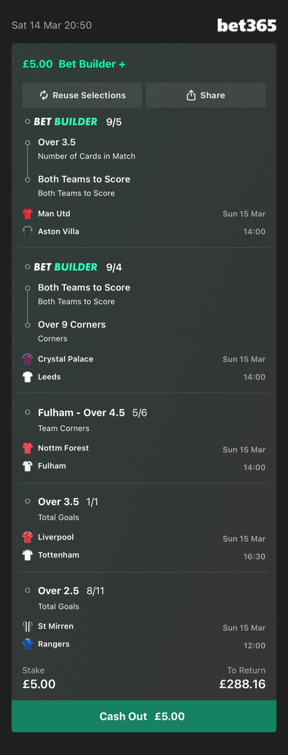 This accumulator is with Bet365. There is a link below which will add each selection directly to your bet slip in just 1 click!