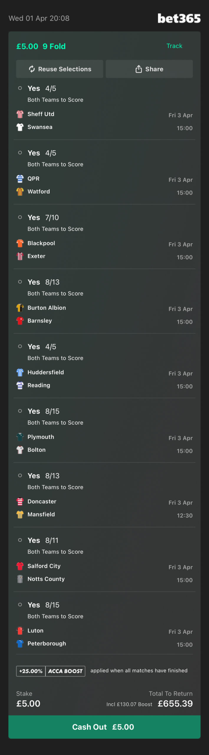 This accumulator is with Bet365. There is a link below which will add each selection directly to your bet slip in just 1 click!