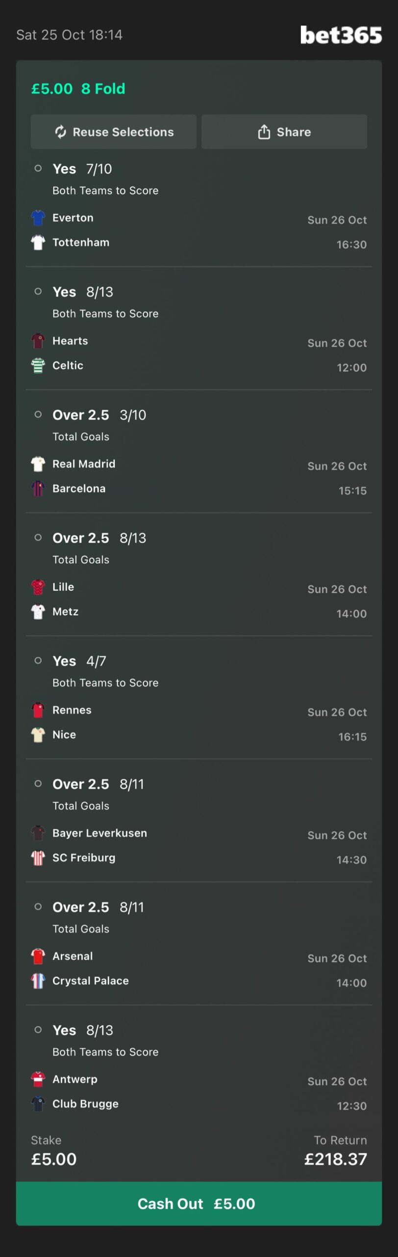 This accumulator is with Bet365. There is a link below which will add each selection directly to your bet slip in just 1 click!