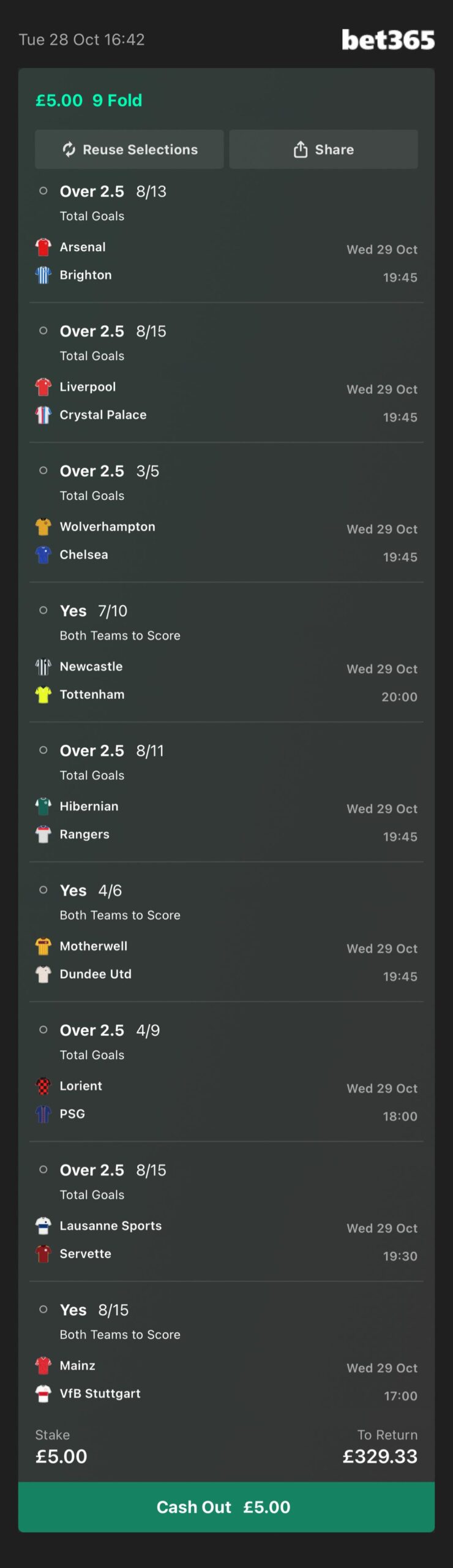 This accumulator is with Bet365. There is a link below which will add each selection directly to your bet slip in just 1 click!