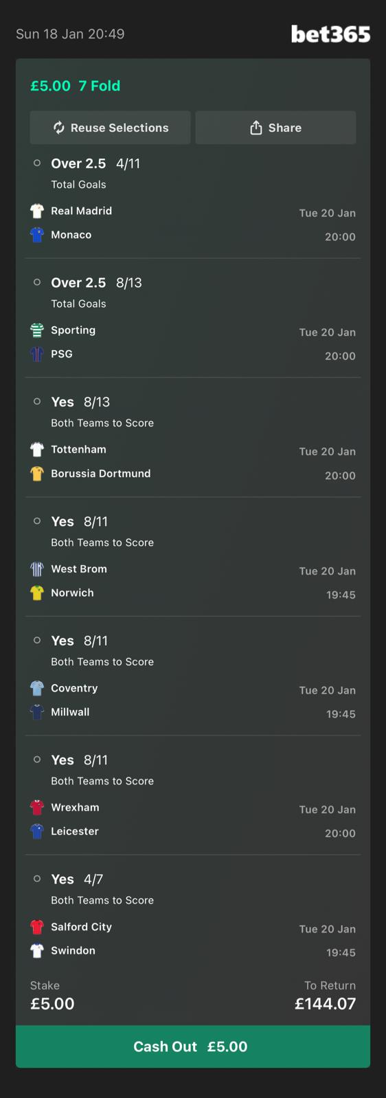 This accumulator is with Bet365. There is a link below which will add each selection directly to your bet slip in just 1 click!