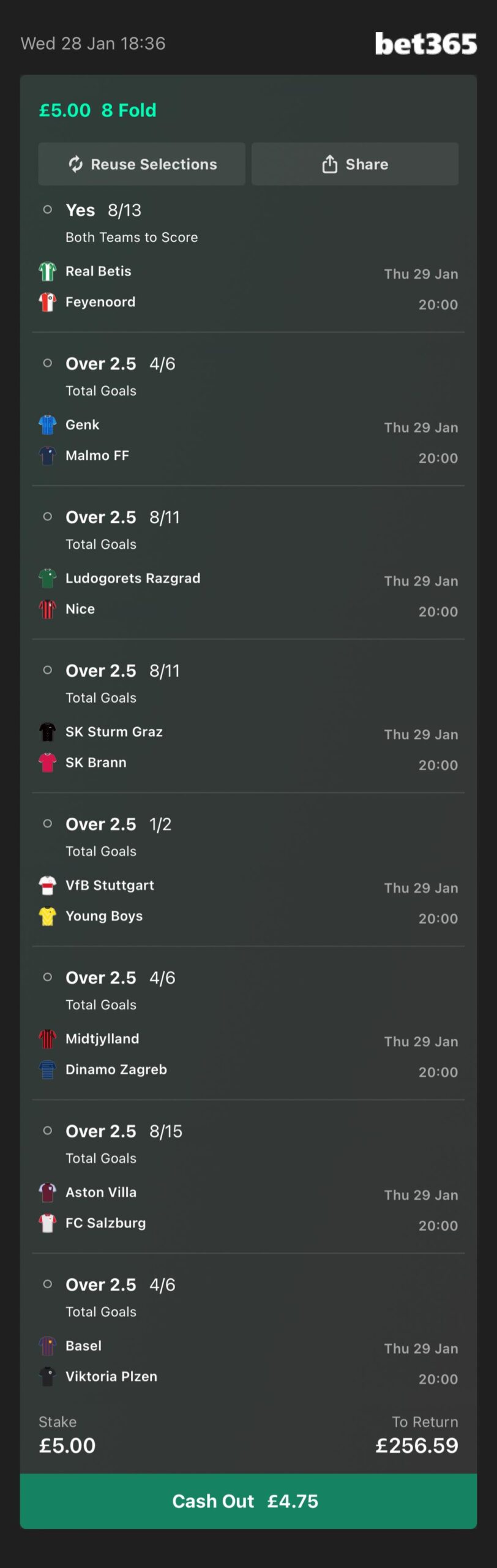 This accumulator is with Bet365. There is a link below which will add each selection directly to your bet slip in just 1 click!