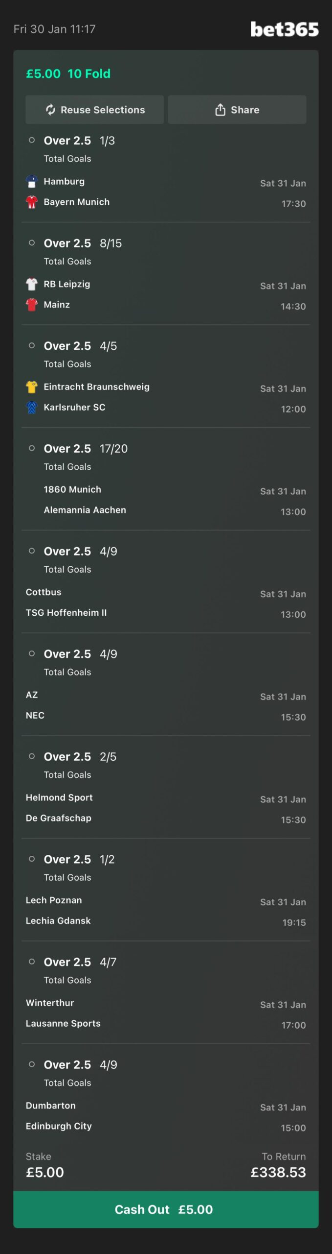 This accumulator is with Bet365. There is a link below which will add each selection directly to your bet slip in just 1 click!