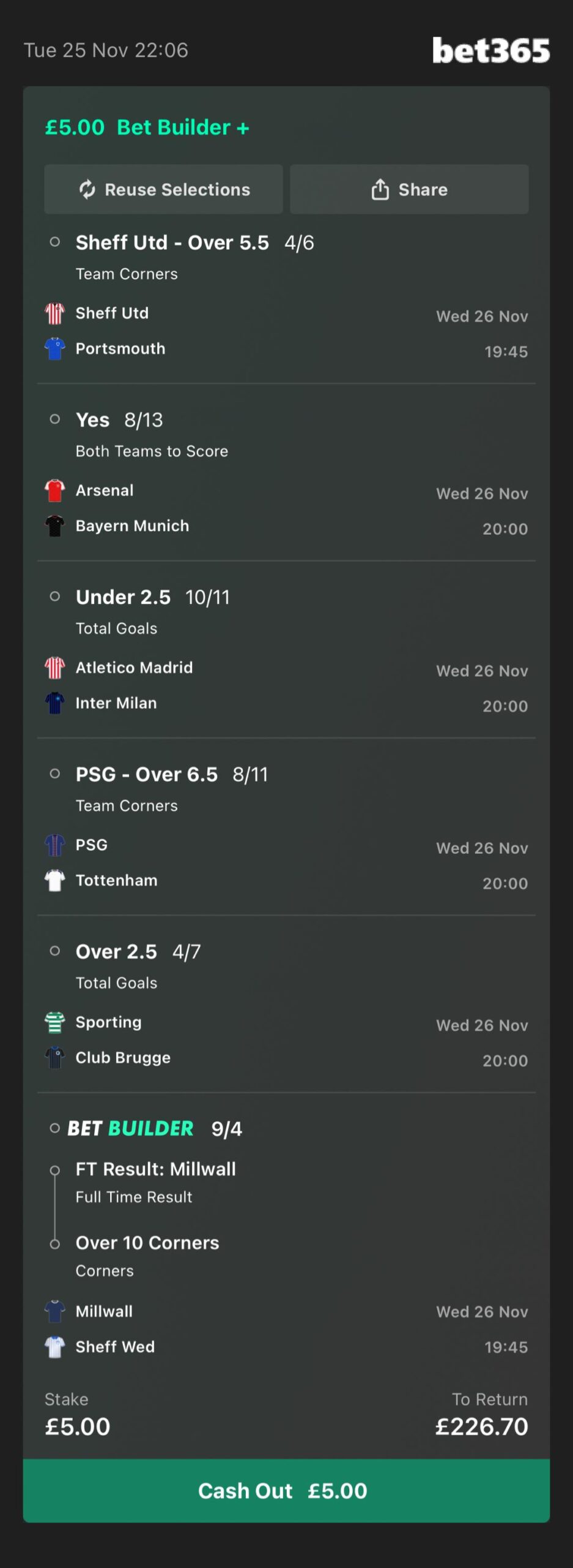 This accumulator is with Bet365. There is a link below which will add each selection directly to your bet slip in just 1 click!
