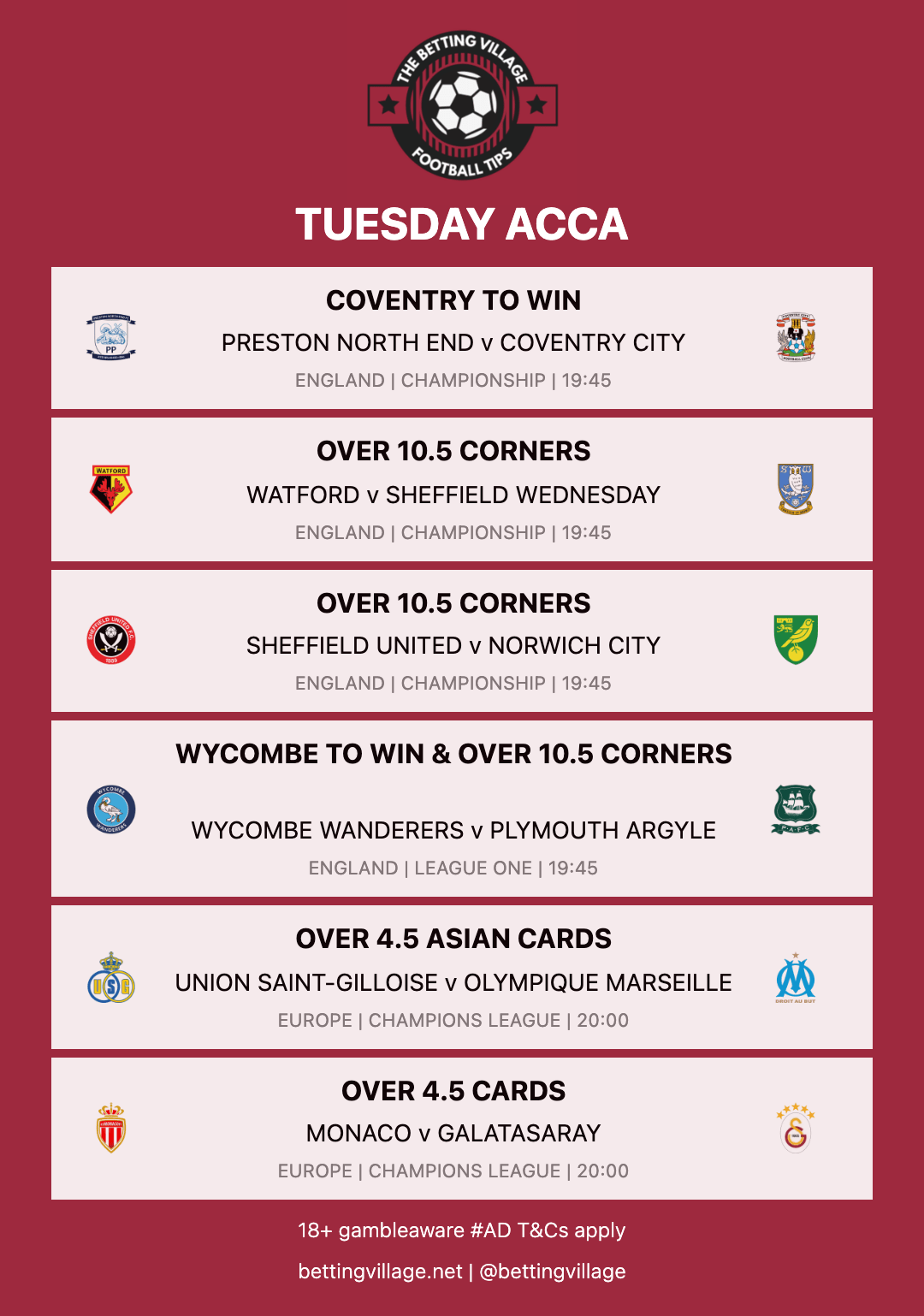 This accumulator is with Bet365. There is a link below which will add each selection directly to your bet slip in just 1 click!
