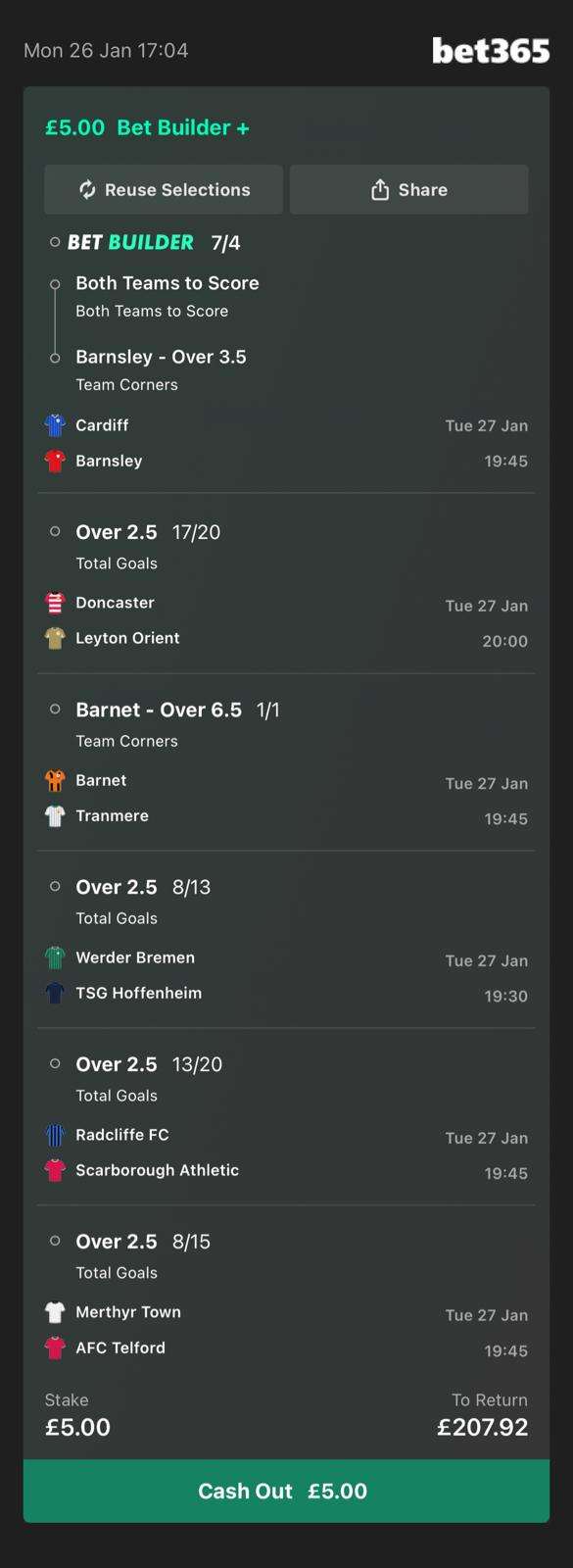 This accumulator is with Bet365. There is a link below which will add each selection directly to your bet slip in just 1 click!