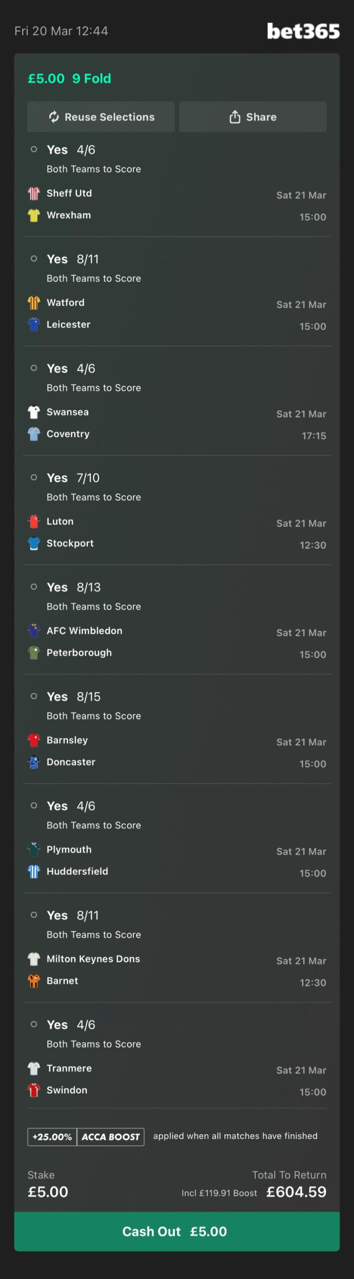 This accumulator is with Bet365. There is a link below which will add each selection directly to your bet slip in just 1 click!