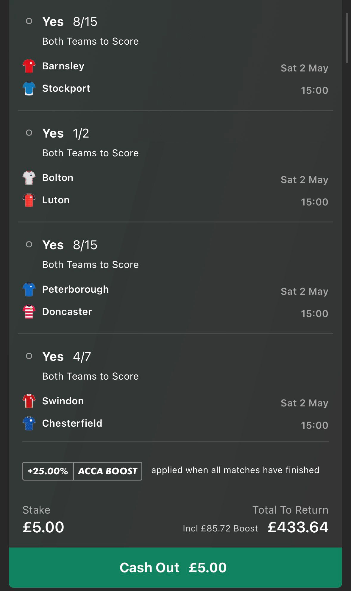 65/1 + a 25% Acca Boost at the time of posting. Prices subject to change. Always check each selection matches up to the image above.