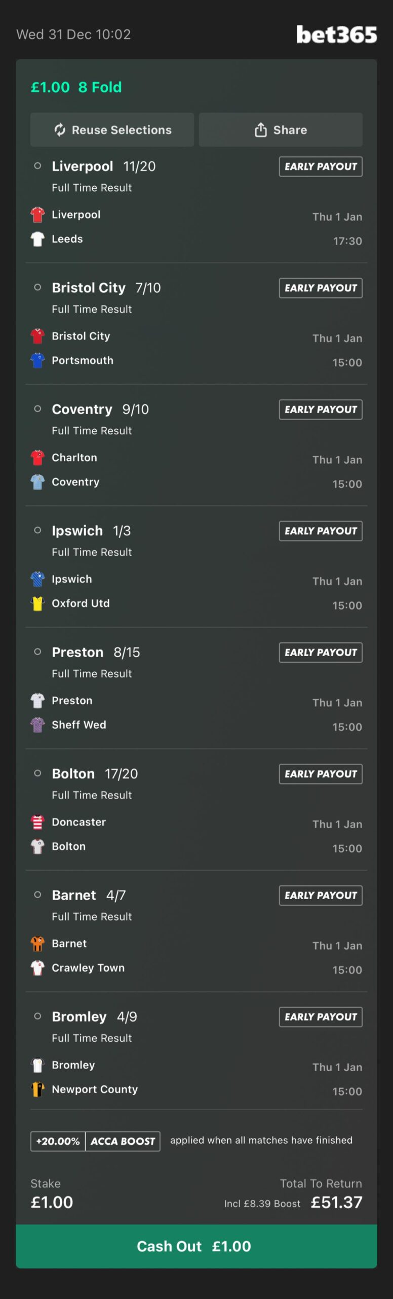 39/1 + 20% Acca Boost at the time of posting. Prices subject to change. Always check each selection matches up to the image above.