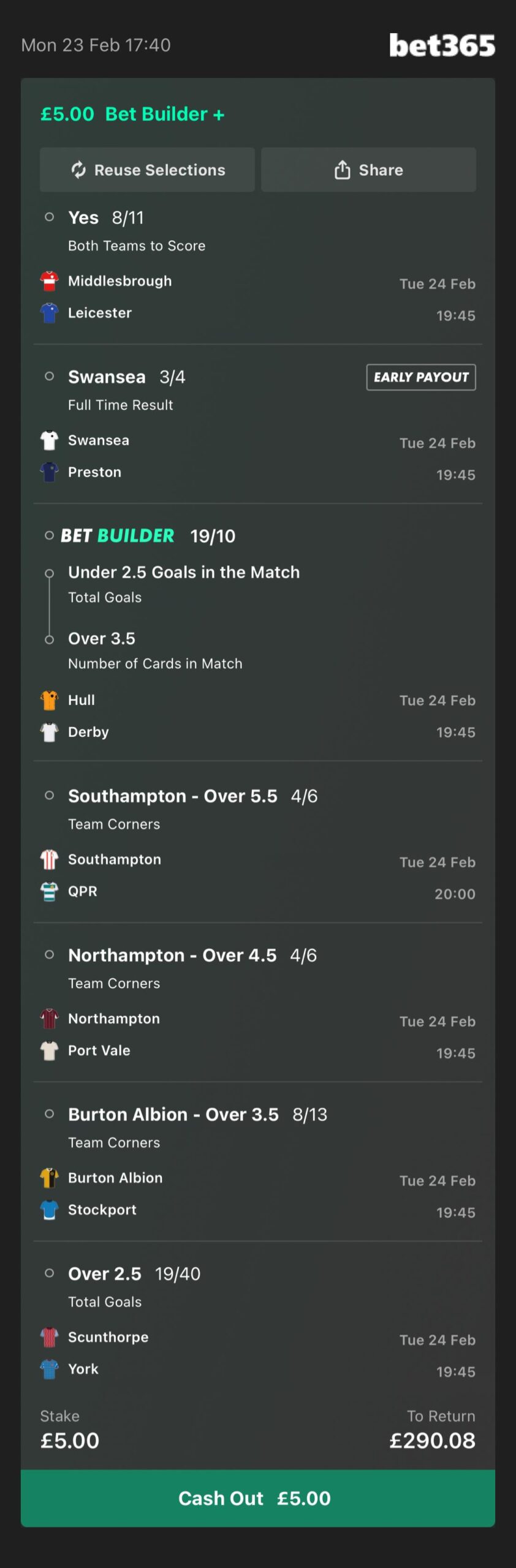 This accumulator is with Bet365. There is a link below which will add each selection directly to your bet slip in just 1 click!